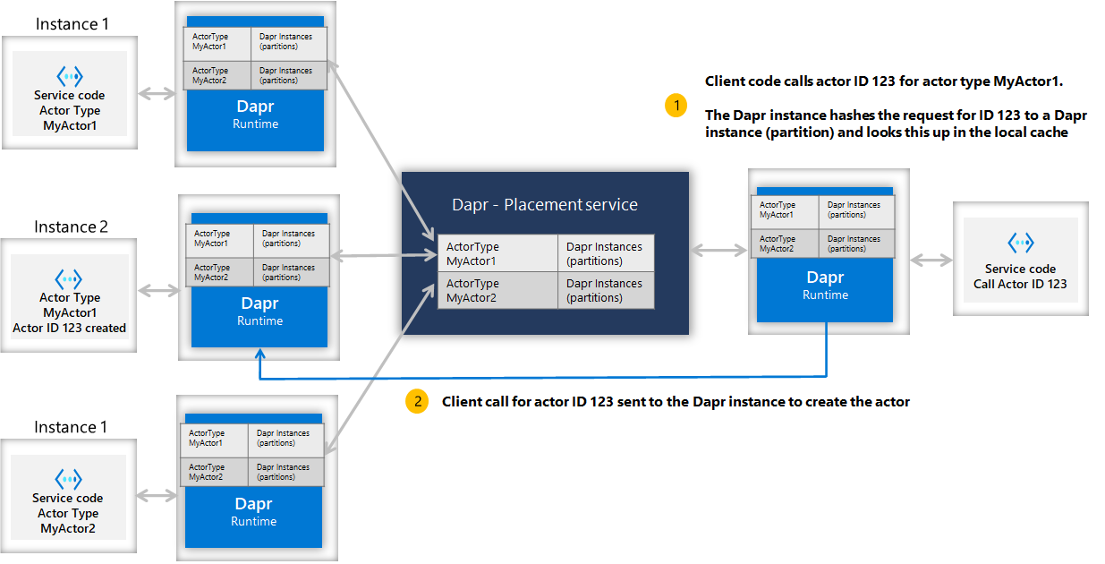 When a client calls an actor with a particular id (for example, actor id 123), the Dapr instance for the client hashes the actor type and id, and uses the information to call onto the corresponding Dapr instance that can serve the requests for that particular actor id. As a result, the same partition (or service instance) is always called for any given actor id. This is shown in the diagram below.