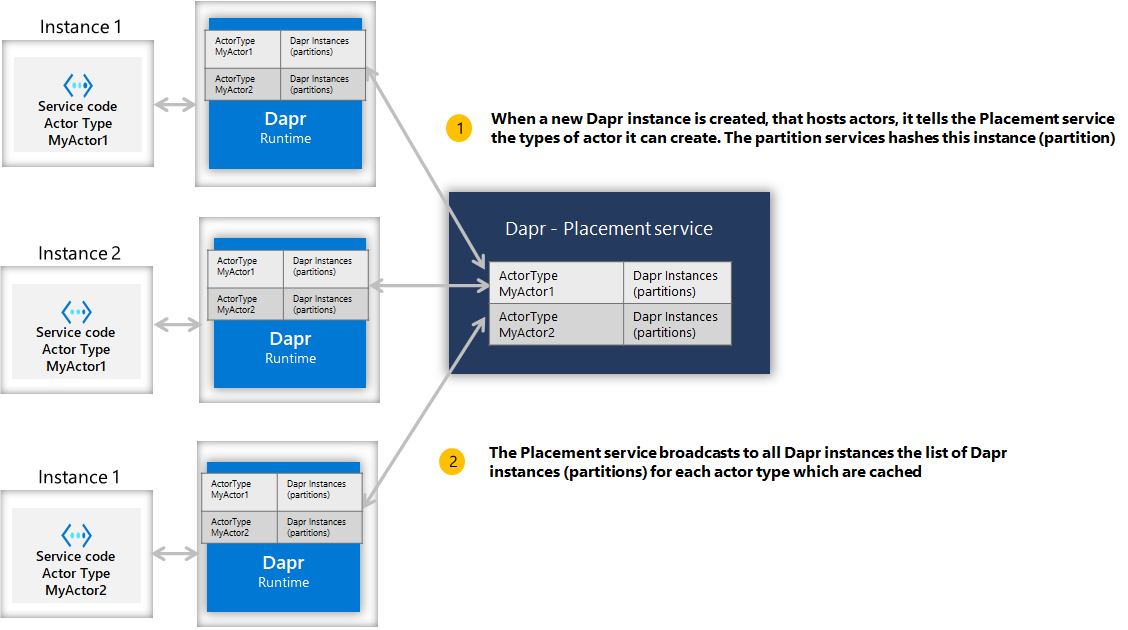 This partition data table for each actor type is updated and stored in each Dapr instance running in the environment and can change dynamically as new instances of actor services are created and destroyed.