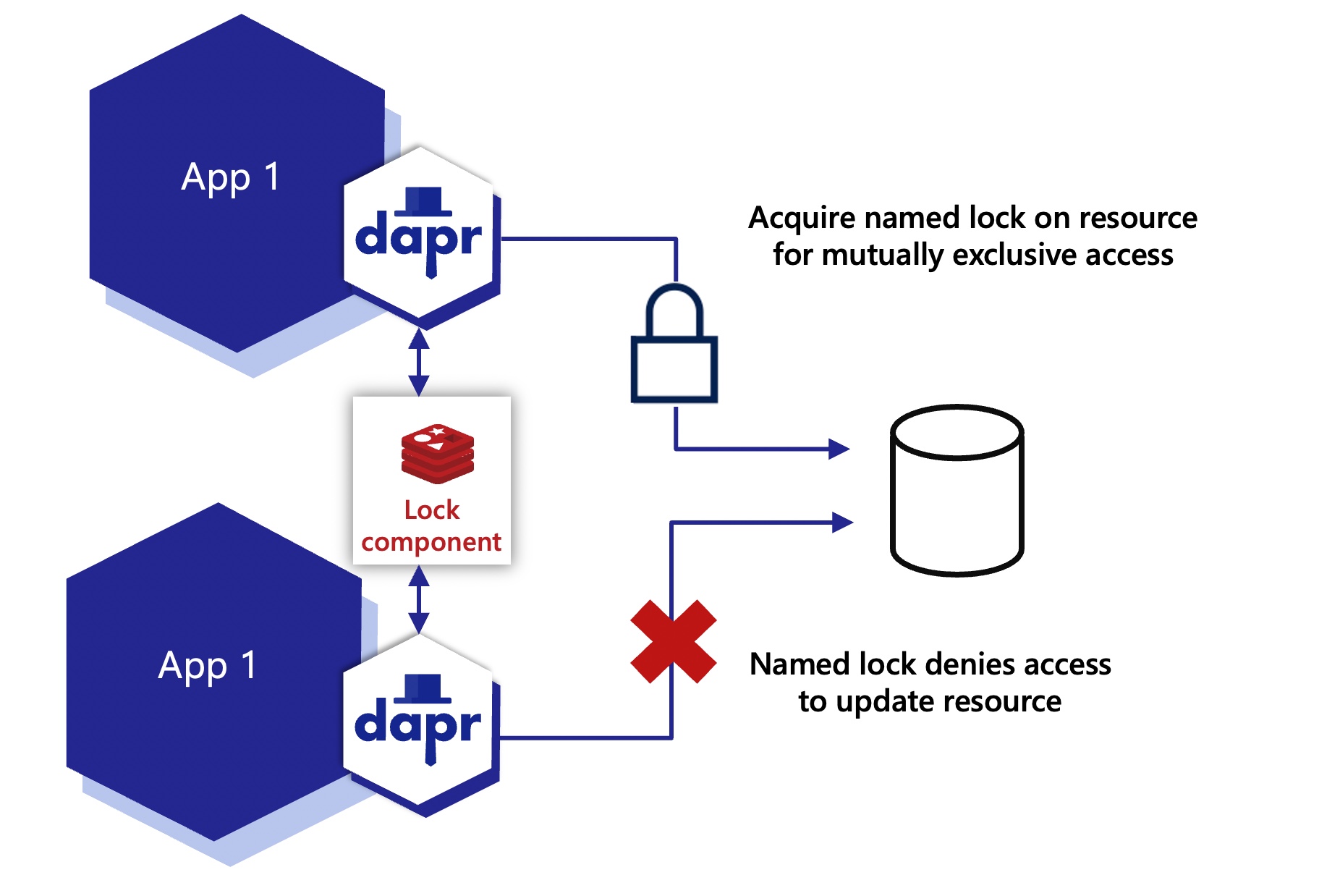 In the diagram below, two instances of the same application, App1, use the Redis lock component to take a lock on a shared resource.