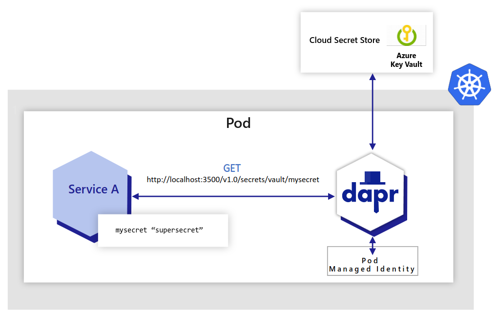 - Dapr uses pod identities to retrieve secrets from Azure Key Vault on behalf of the application.