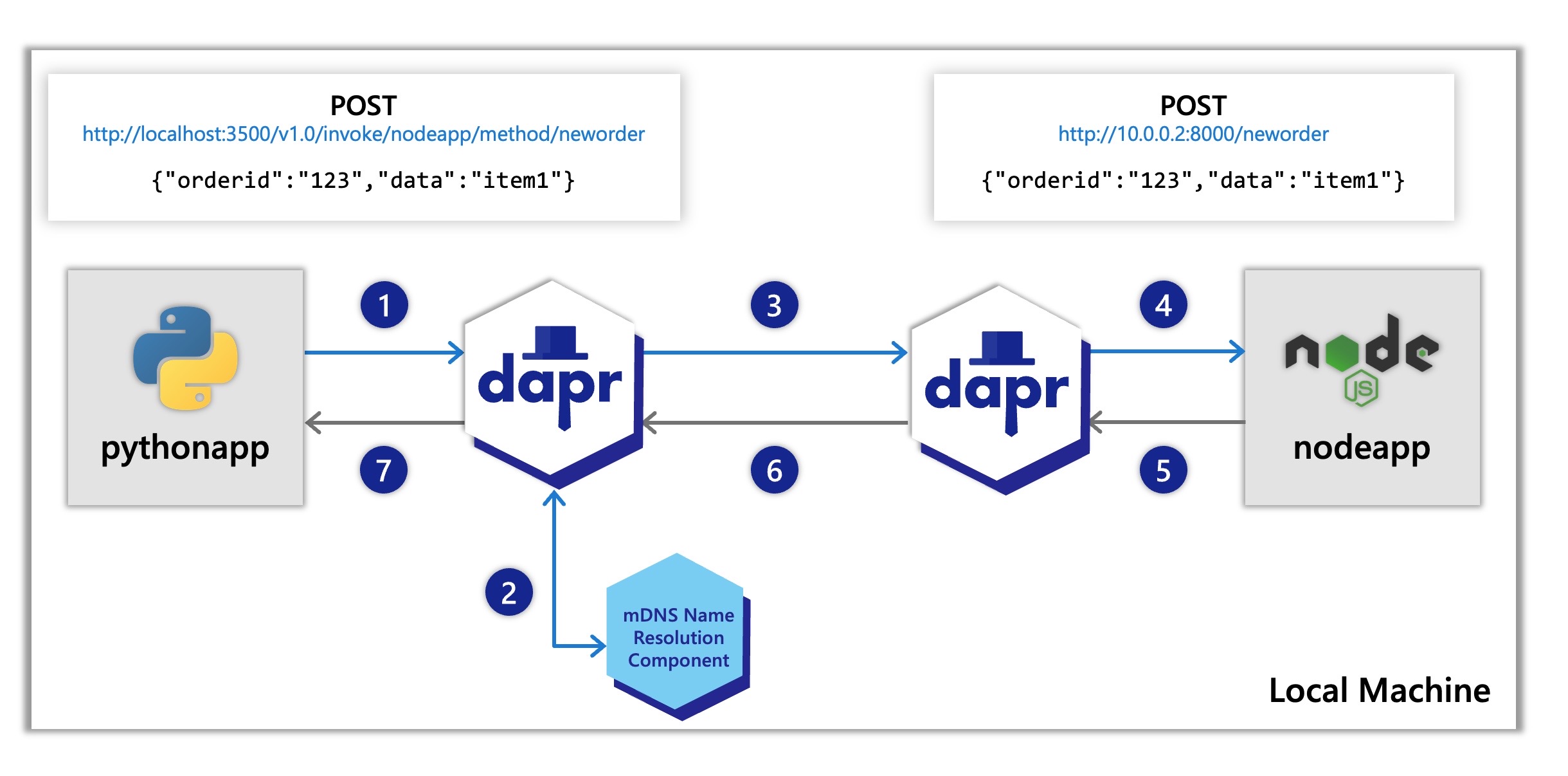 2. Dapr discovers the Node.js app’s location using name resolution component (in this case mDNS while self-hosted) which runs on your local machine.