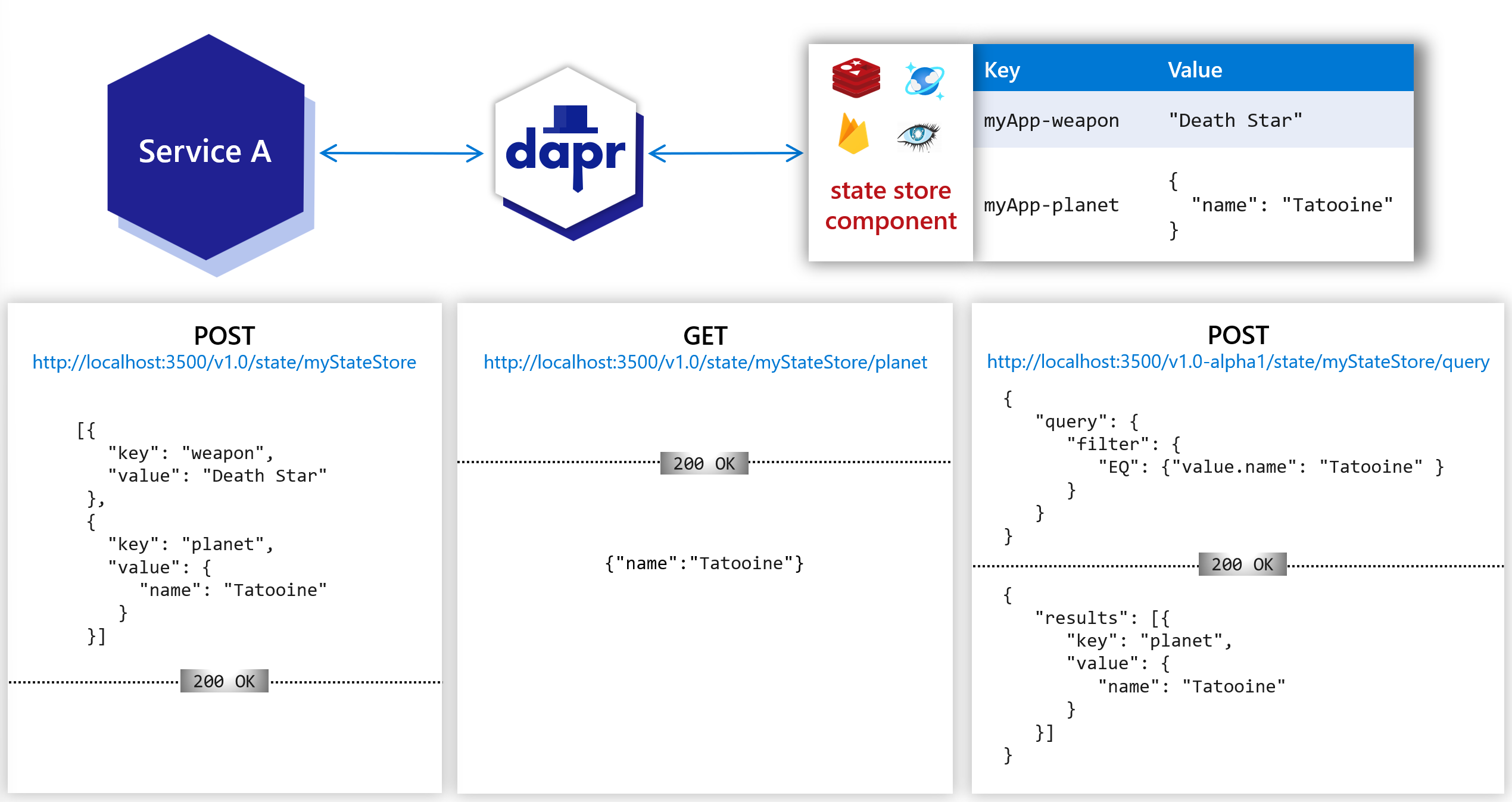 With Dapr, you can include additional metadata in a state operation request that describes how you expect the request to be handled. You can attach: