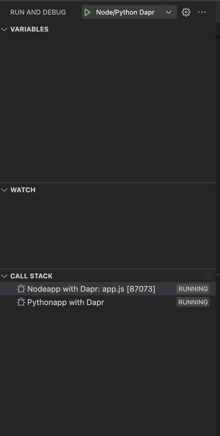 In the case of the hello world quickstart, two applications are launched, each with its own Dapr sidecar. One is written in Node.JS, and the other in Python. You’ll notice each configuration contains a daprd run preLaunchTask and a daprd stop postDebugTask.