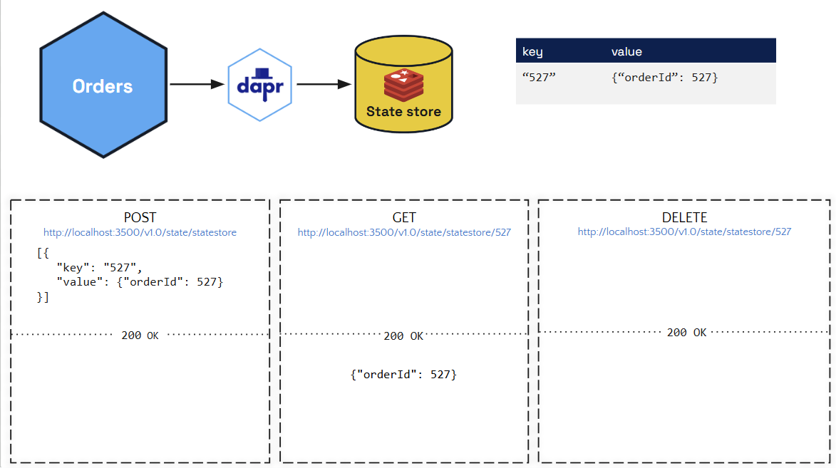 Notice, as specified in the code above, the code saves application state in the Dapr state store, reads it, then deletes it.
